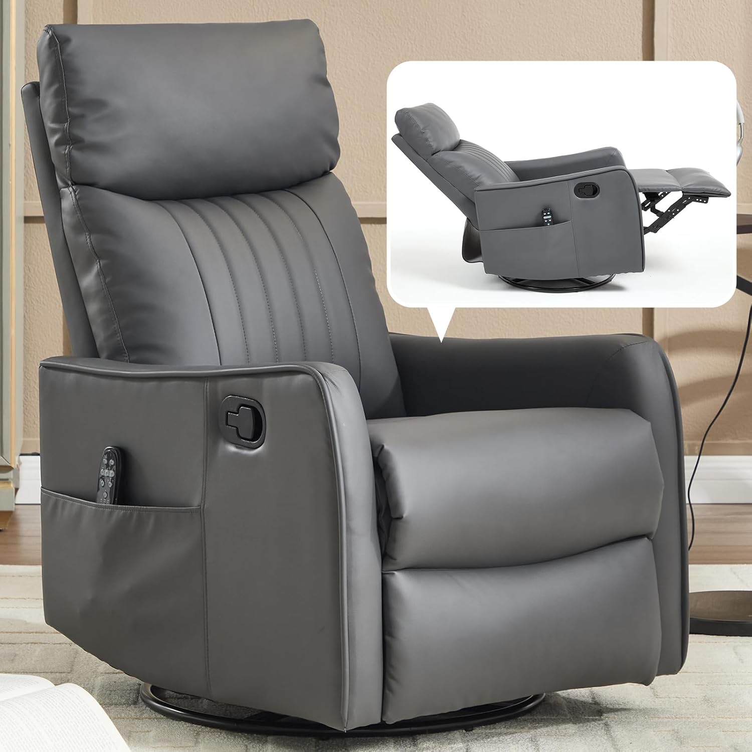 Why is this recliner perfect for small spaces?This slim recliners for small spaces offers a reclining angle of up to 155° and fits seamlessly into compact rooms; It’s ideal for creating a cozy spot in living rooms or bedrooms without taking up too much spaceHow does the swivel rocking feature enhance comfort?This lazy boy recliner chair for bedroom features a 360° swivel base and gentle rocking functionality; The smooth motion adds a relaxing touch to your lounging experienceWhat makes this chair ergonomically supportive?Equipped with an adjustable backrest and footrest, this swivel rocker chair ensures ultimate comfort; It provides proper support for extended sitting or nappingHow does the storage design make life easier?With built-in side pockets, this fabric recliner chairs for adults offers convenient storage for remotes, magazines, or essentials; Keeping everything you need within easy reachIs this chair built to last?Constructed with a strong frame and high-quality materials, this grey recliner chair delivers durability and style; It’s perfect for everyday use and long-term reliabilityIs assembly simple?Yes, no tools are required for setup; This rocker recliner chairs for adults comes with easy-to-follow instructions and a reliable support team to assist you if neededProduct Details:Reclining Angle: Up to 155°Functions: Swivel and rockingMaterial: Premium fabricBuilt-in Storage: Side pocketsDimensions: Compact for small spacesPlease Note:Colors may vary slightly due to screen settingsDimensions are approximate due to manual measurements
