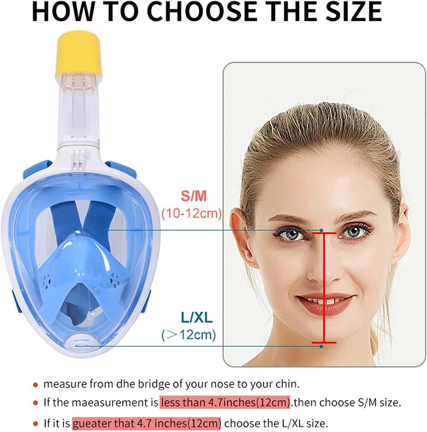 We are committed to providing more comfortable, convenient and safer products for the majority of diving and swimming funs. We hope you can use our products to have a very good diving or swimming experience.your satisfaction is our greatest pursuit and achievement. Full face snorkel mask allows user breathe through mouth or nose while snorkeling with no mouthpiece. With snorkel tube allow you to diving deeper.Separate inhaling and exhaling channels that creates an airflow away from your main viewing Vision that helps eliminates fogging and will keep you snorkeling longer. A ball at the top of the tube will automatically seal the air valve to stops salt water from getting into your mouth and prevents gagging, Spend less time worrying about water in your mask and more time snorkeling. Adjustable elastic fabric headband, easy to wear and suitable for all kinds of head shape. hint: 1. Due to different monitors and lighting effects, the actual color of the item may be slightly different from the color shown on the picture. Thanks! 2. Please avoid 1-3cm measurement deviation due to manual measurement.