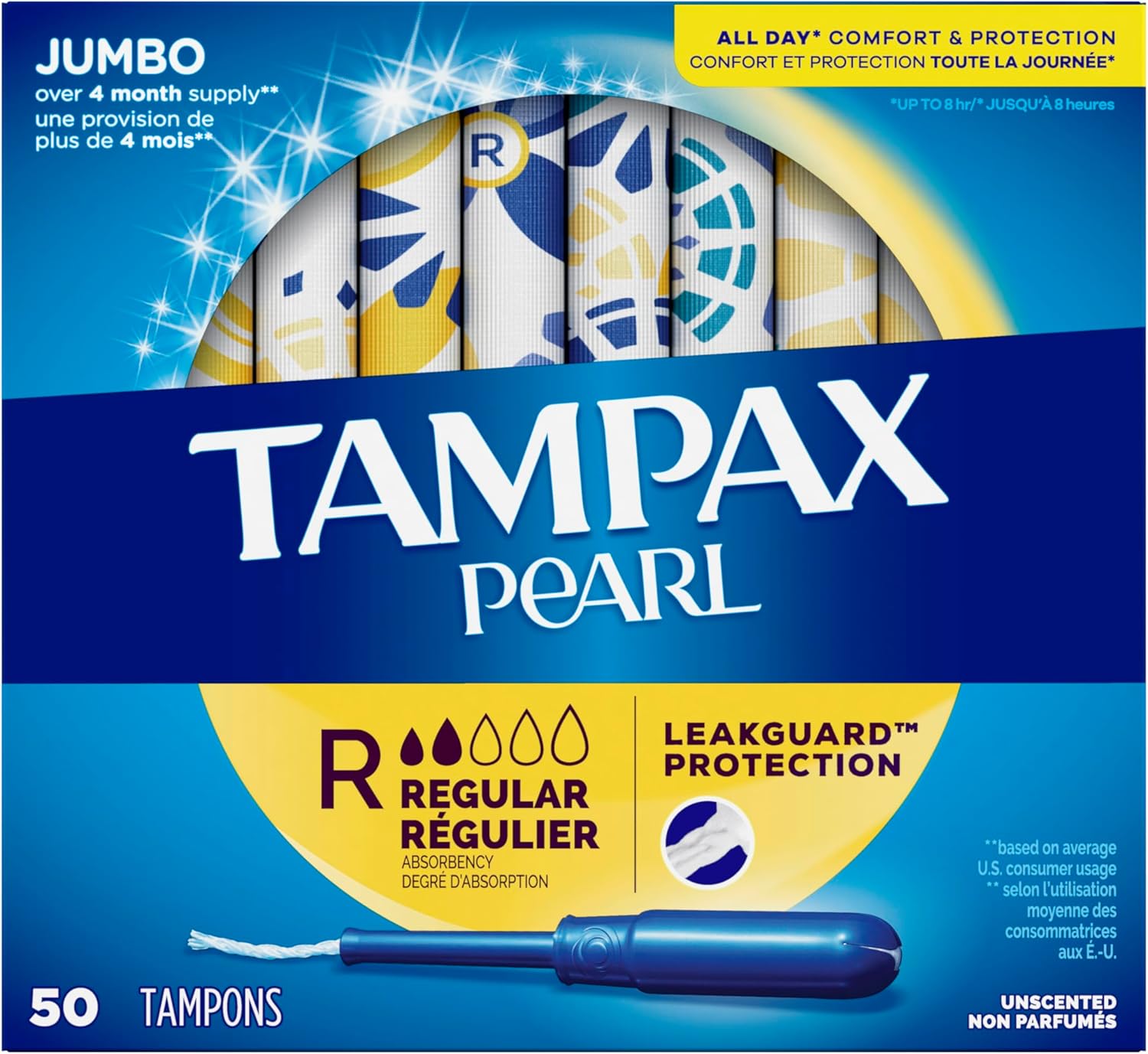 Only Tampax Pearl tampons come in five different absorbencies, so you can move up or down to find what's right for you. Your flow is different every day, so your tampon should be, too. Whatever their absorbency, all Tampax Pearl tampons feature a LeakGuard braid that helps stop leaks with a core free of dyes*. Their FormFit design gently expands to your individual shape, while their smooth removal layer ensures amazing comfort.Tampax Pearl Regular Absorbency tampons are free of perfume and chlorine bleaching, and clinically tested to be gentle on skin. Choose the level of absorbency that’s best for you and your flow, and consider switching between different absorbencies during your period. Find your flow combo with Tampax Pearl.*Braid has skin-friendly pigments.