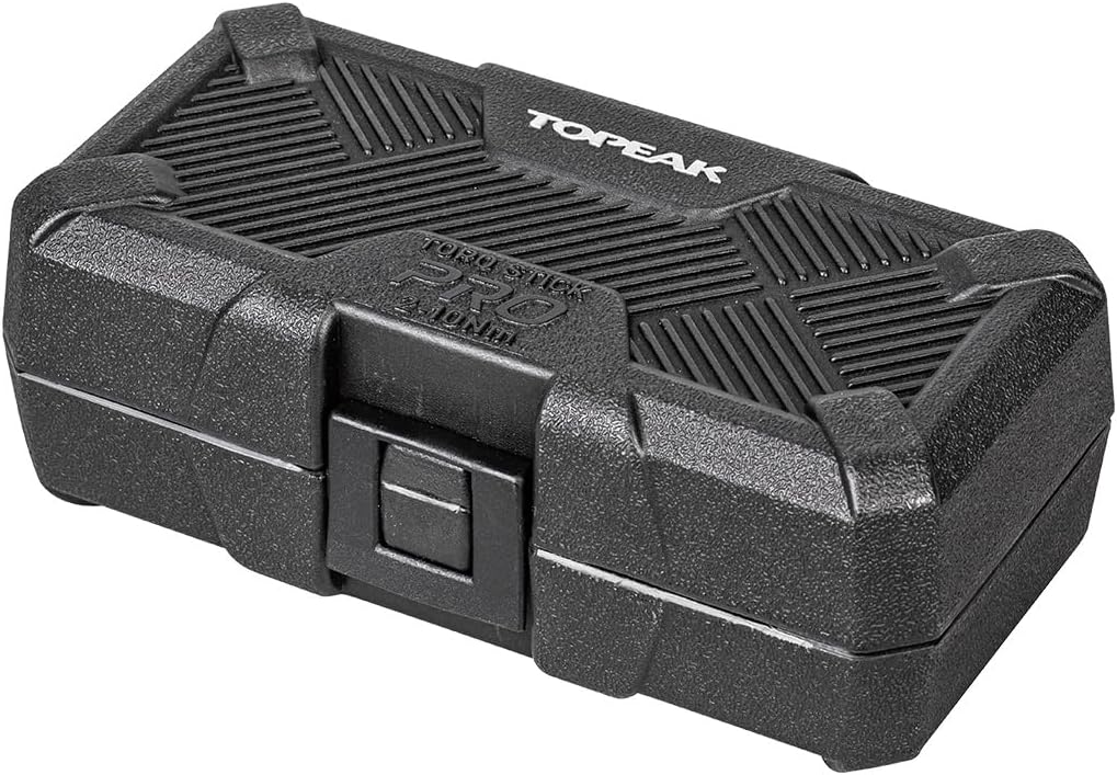 Torq Stick 2-10Nm Pro version. Torque wrench with adjustable preset range of 2-10Nm features a standard hex drive reversible ratcheting head. Includes magnetic bit holder for adding leverage, fingertip bit holder for narrow space, and 9 tool bits with a generous 30mm length for reaching tough bolt locations. Knurling on the individual tool bits provides additional grip when changing or removing from the organizer and ratchet tool head. Fits neatly into a storage box.