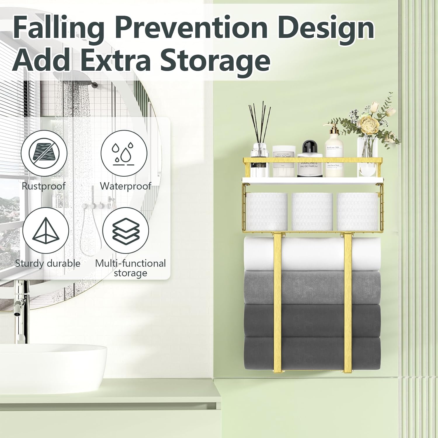 Towel Racks for Bathroom, Bathroom Shelf Over Toilet,Floating Shelves with Towel Rack Paper Holder Storage Basket,Floating Shelves for Wall Decor,Golden