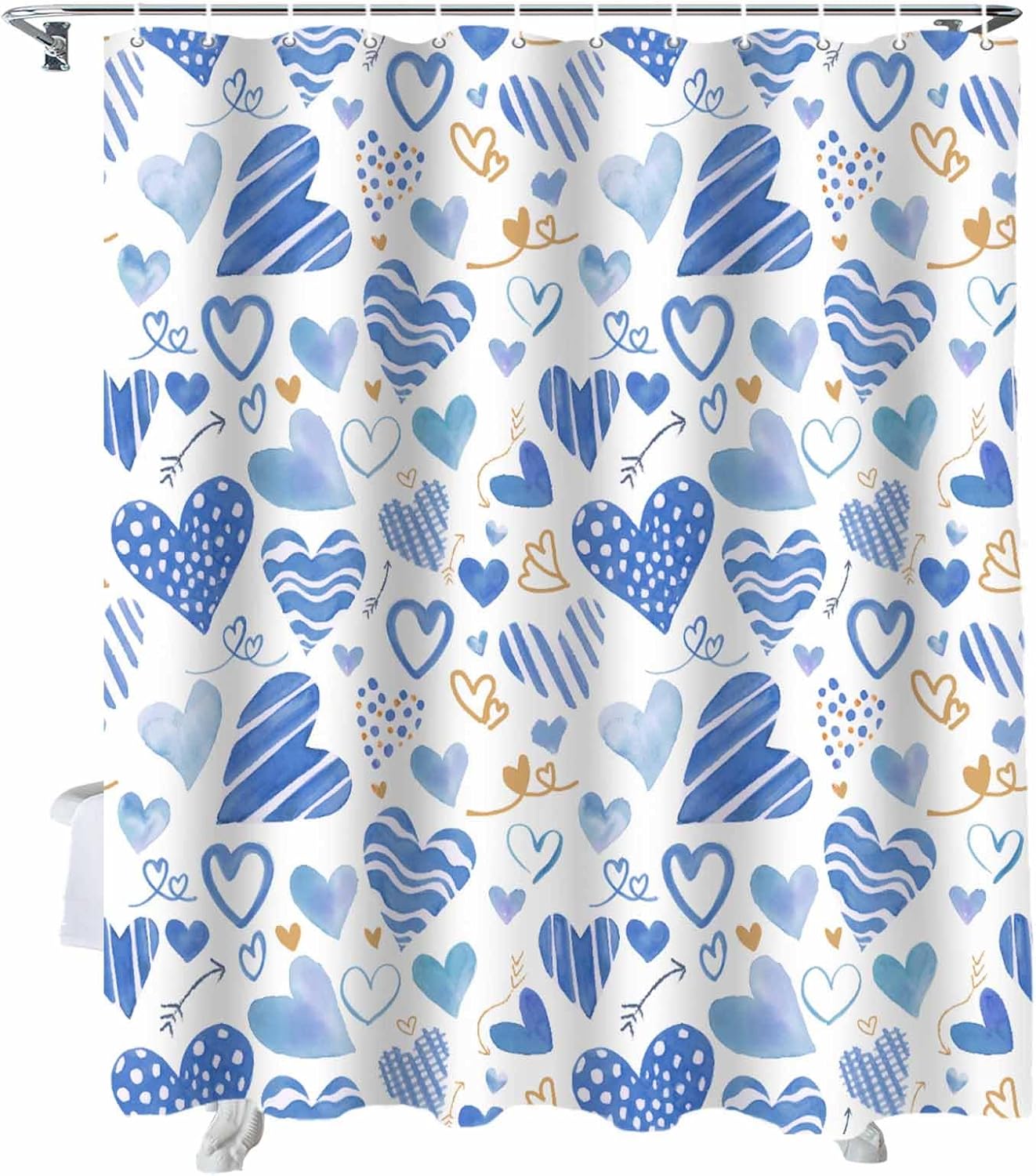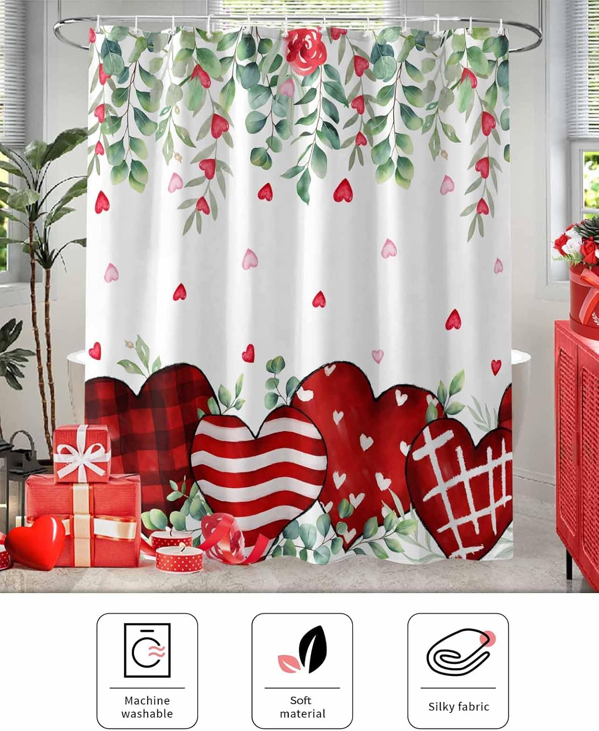 Valentine's Day Shower Curtain, Waterproof Fabric Shower Curtains, Love Heart Shower Curtain for Bathroom Decor AccessoryPackageOur shower curtain set includes 1 shower curtain and plastic hooks.Premium MaterialSoft polyester fabric to touch, lightweight, waterproof, reusable and detail sewing, machine washable. It can prevent the splashing of water from the bathtub during bathing.Fine Stitching HemSew along all edges to prevent tearing, durable throughout long-term use.Grommets for TearproofThe metal grommets promote easier hanging and long-lasting strength. Easy to HangEasy to install and hang, with free hooks, fits most bathrooms.Perfect AdditionEffortlessly add a polished feel to your bathroom with this design-minded shower curtain. Classic style and xmas patterns to create a chic winter shower atmosphere.Multi SizeWith a variety of sizes of shower curtain, you can choose the size that suits you according to the actual measurement.Size Dimension:36x72IN=91x183CM454x78IN=137x198CM60x72IN=152x183CM66x72IN=168x183CM72x72IN=183x183CM72x78IN=183x198CM72x84IN=183x214CM72x96IN=183x244CMWarm Tip1. Since we use different displayers, the color of the picture you see may be different from what we see.2. We measure include the edge size, the actual you feel maybe a little shorter, but will not affect your using, please understand. The important, the shower curtain leaves away the ground will be better for hygiene.