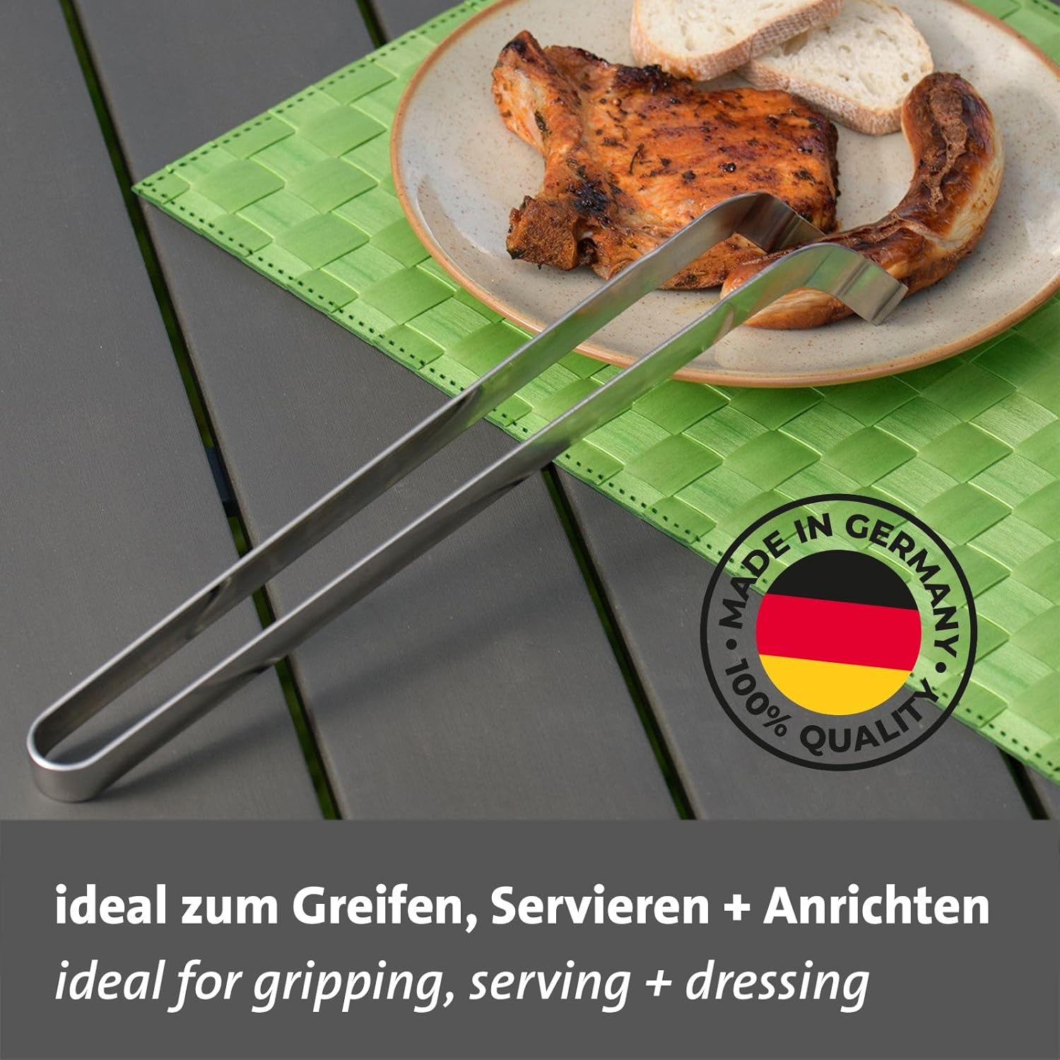 Serving with Westmark - 2 x sausage and serving tongs. These lightweight tongs are the ideal tool for gripping, serving and serving food at the table, at the grill or at the buffet. Especially suitable for sausages and meat, the tongs with their wavy gripping ends and downward angled gripping arms prevent food from slipping off, even with individual sausages. Reliable helper in the kitchen The tongs are heat resistant up to 150 degrees making them ideal for use on the grill. It impresses with its easy handling and the particularly narrow handles made of stainless steel, which ensure a secure hold when frying. Made in Germany, the pliers guarantee the highest quality and durability. It is made from one piece, which allows easy and residue-free cleaning. Thanks to the solid workmanship, the tongs are dishwasher safe. We take responsibility The energy and performance efficient production of kitchen utensils has been the core of our self-concept since 1956. As a certified production company, we guarantee the highest quality standards and regularly put all processes to the test. So we take responsibility - for a clean future!