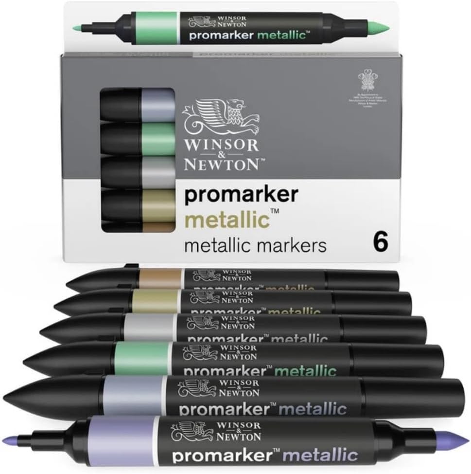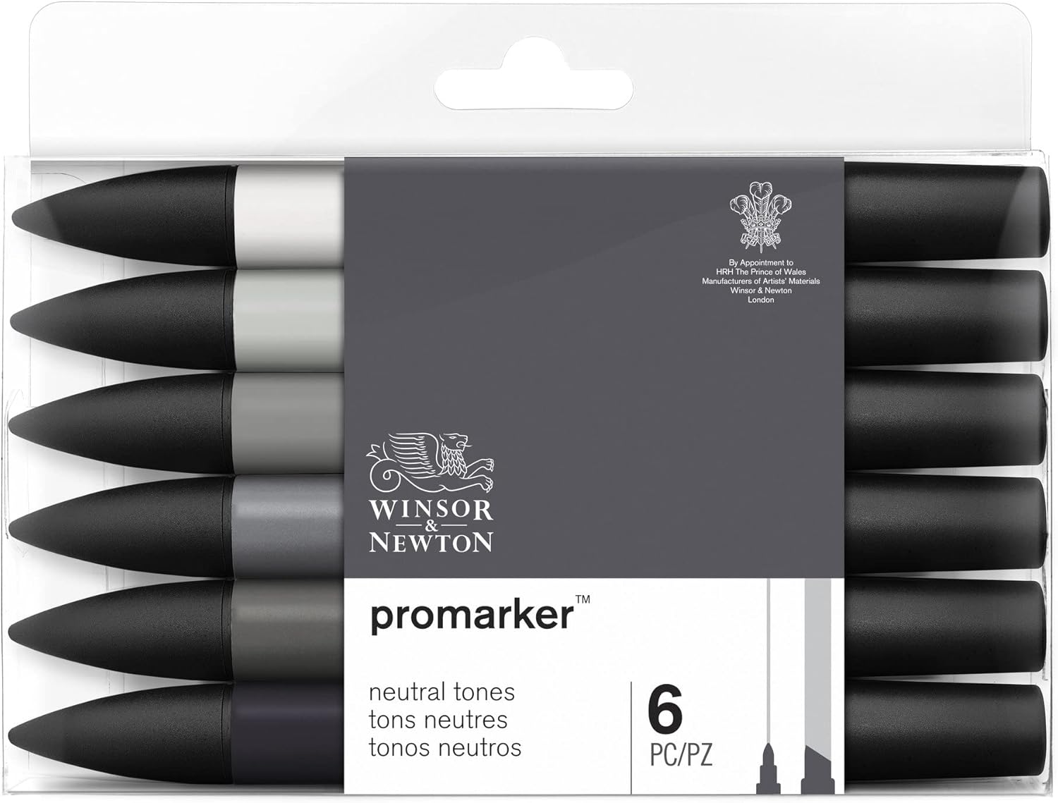 Winsor & Newton Promarker Neon provides flawless, even application, consistent coverage, and no streaking, making them ideal for design, illustration, comic art, and crafts. Twin-tipped markers: broad and smaller bullet nibs. Set contains Luminous Yellow, Radiant Orange, Spark Red, Electric Pink, Volt Blue, and Glowing Green.