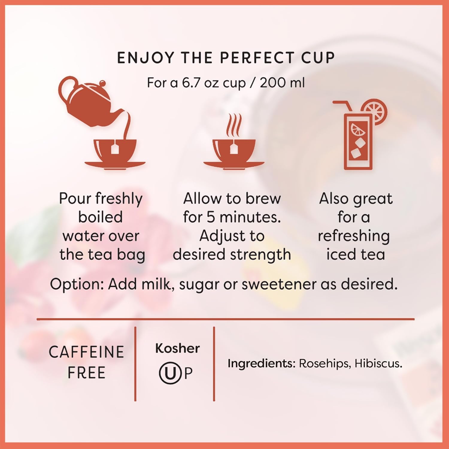 Experience the enchanting fusion of rosehip and hibiscus, offering a harmonious blend of exotic and floral nuances for a truly enchanting tea journey. Crafted with ingredients that may contribute to immune support, this tea introduces a thoughtful wellness component to your daily routine. Relish the velvety and inviting characteristics of our caffeine-free tea blend, featuring the delightful flavors of hibiscus and rosehips without the jolt of caffeine. Perfect for unwinding after a hectic day or infusing a touch of sophistication into your afternoon tea rituals. Whether you crave the cozy warmth of a soothing cup or the revitalizing coolness of iced tea, our blend caters to your every mood. Embrace the delightful flavors year-round, indulging in them however you please.