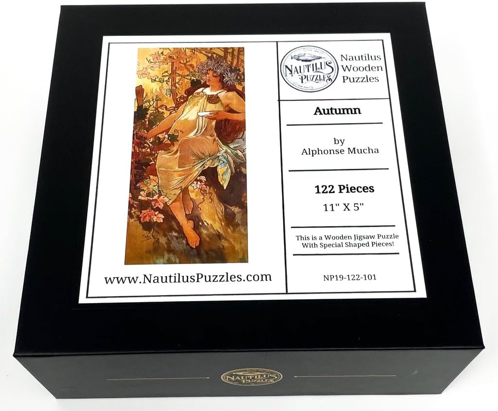 Autumn by Alphonse Mucha, Wooden Jigsaw Puzzle - 122 Pieces, finished size 11” x 5”, is a beautiful Fall Art Nouveau print in the classic Mucha style. THE PERFECT GIFT FOR PUZZLE DOERS - Wooden Jigsaw Puzzles make the perfect gift for Christmas, Hanukkah, Mother’s Day, Father’s Day, Birthday, Anniversary and Retirement. EVERY LASER CUT NAUTILUS WOODEN JIGSAW PUZZLE is manufactured in the U.S.A. from 4mm Finnish Birch Plywood that has been harvested from sustainably managed forests. The puzzles are cut in the classic Victorian puzzle style and feature creative, intricate pieces, and many shaped figural whimsy pieces, that are designed to match the theme, style and art of the puzzle. The cutting technique guarantees that every piece is a little work of art. Wooden Puzzles do not interlock in the same way as cardboard puzzles, so there is a different tactile experience in putting the puzzle together, making the puzzle more challenging to work, but incredibly entertaining. This is a 122 pieces random Victorian cut full color autumn Art Nouveau jigsaw puzzle with unique pieces. Keep it for yourself or give it to a friend or family member as a gift. Wooden puzzles are designed to be collectible and the sturdy wooden construction allows them to be handed down as heirlooms from generation to generation. Regardless of your choice, anyone will enjoy the stunning art caught on this captivating puzzle. Perfect for teens, adults, men and women, this design will appeal to a wide range of puzzlers. Wooden Jigsaw Puzzles are a simple pastime. They provide a stress-free, yet challenging and entertaining task that can be enjoyed in front of the fire or on the porch at the end of a long day. Wooden puzzles are also great at keeping your mind sharp and connected as you get older.
